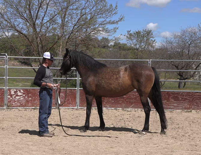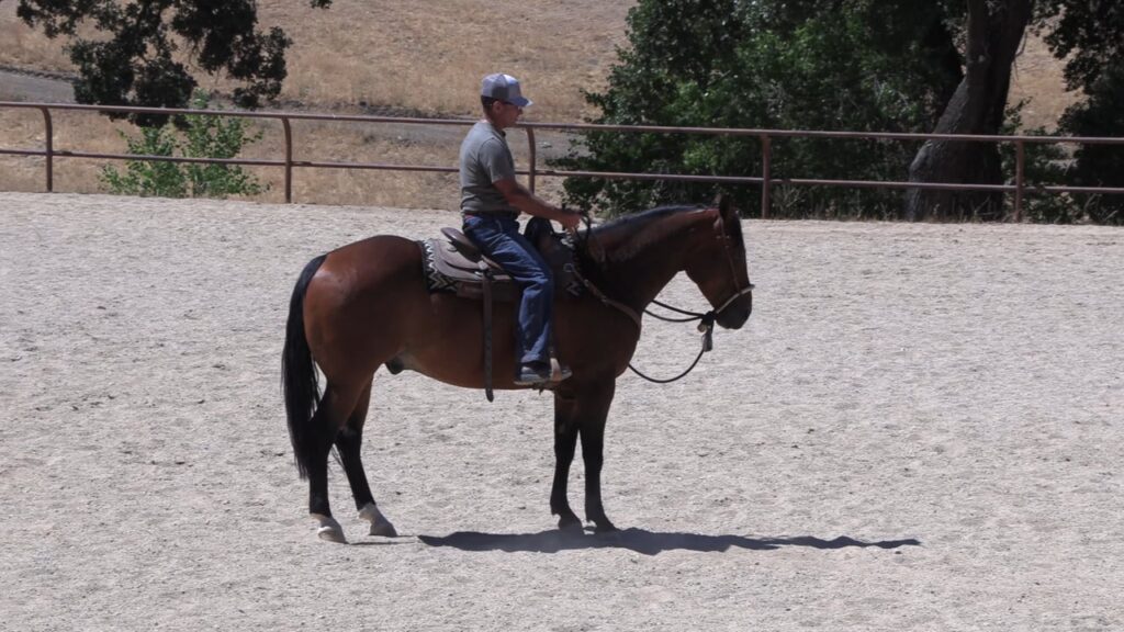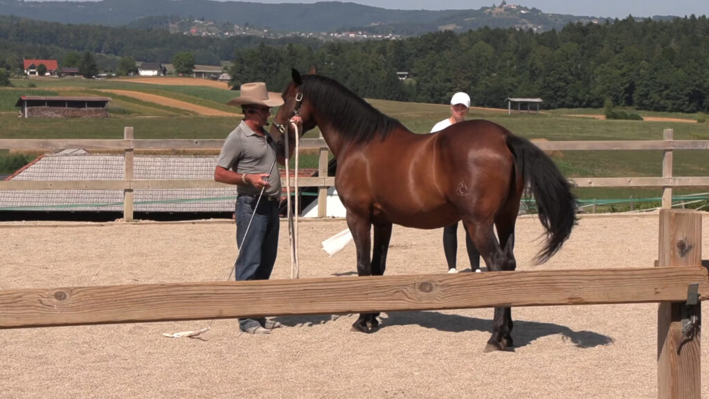 This lesson builds on earlier fence work to introduce sideways movement in open space. The horse has already learned to step laterally off the leg…