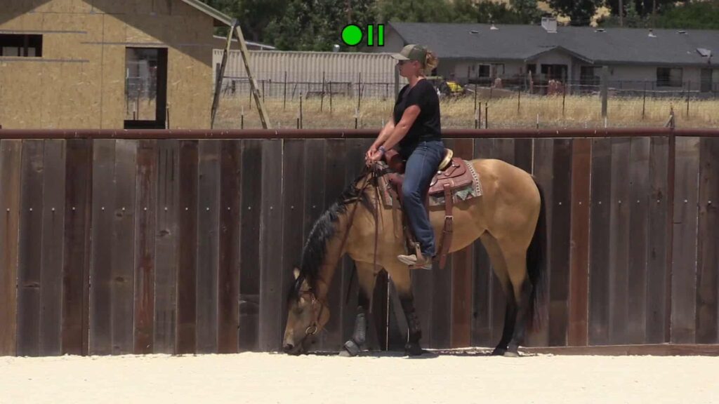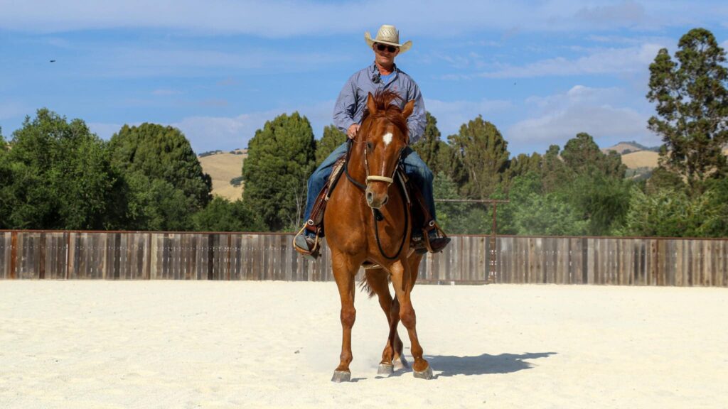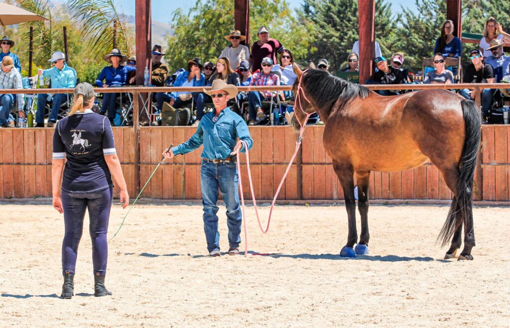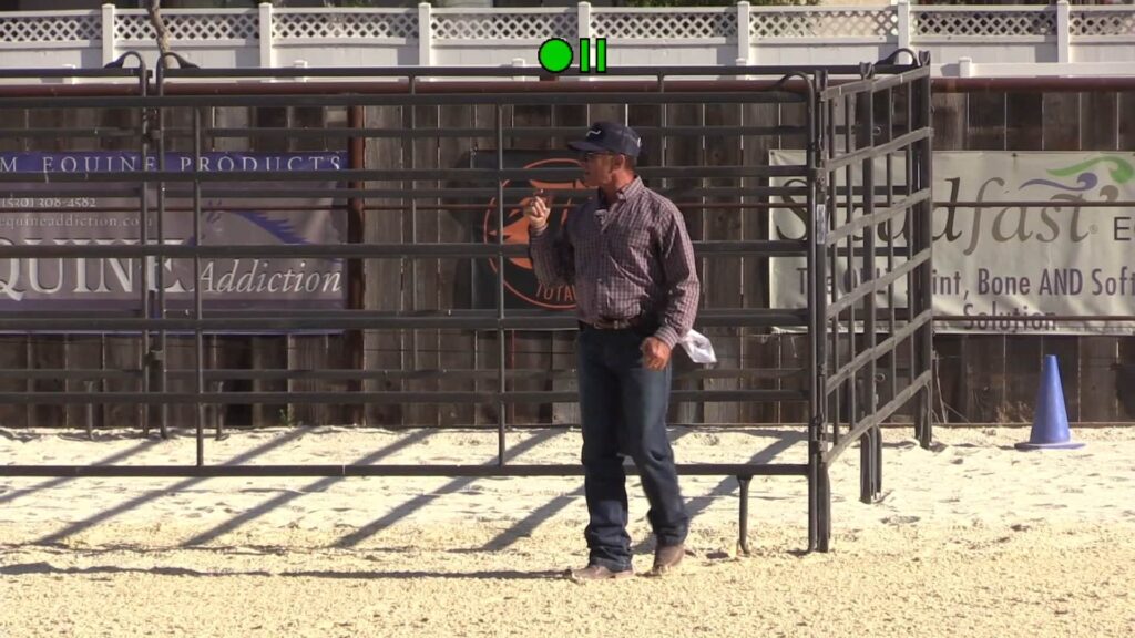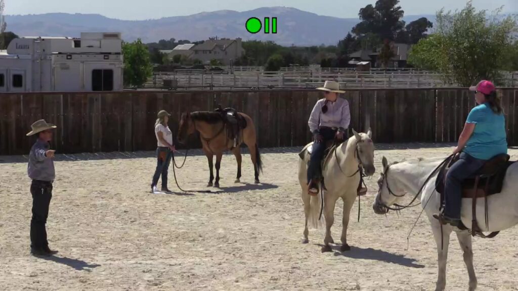 Day 2 of the June 2020 Hollister clinic – Fresian and Mustang being ridden, Arab is in a smaller pen.