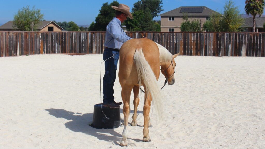 The second day of teaching Dale to come up beside Warwick on the mounting block (bucket).