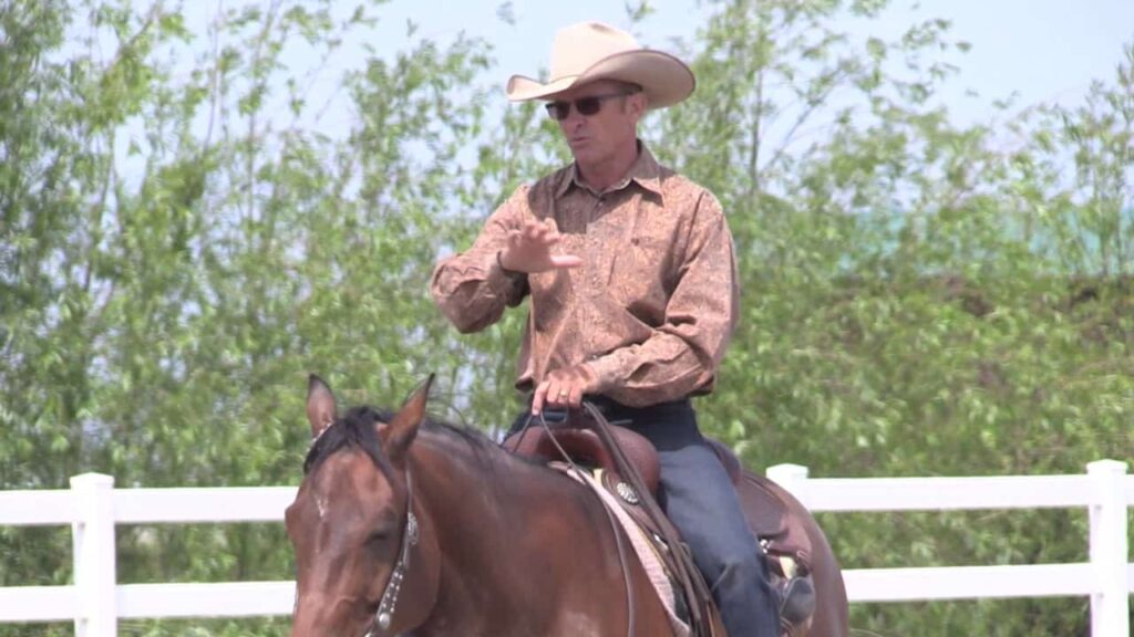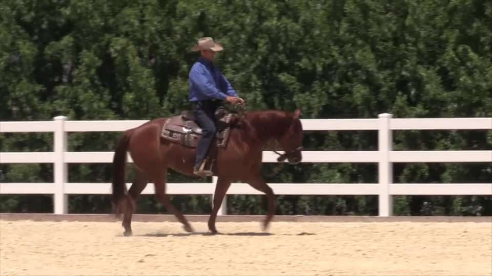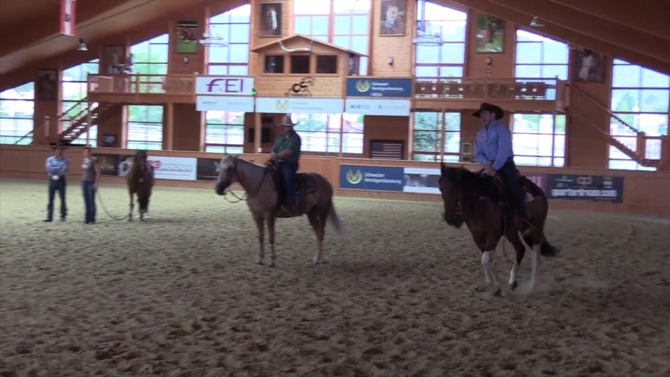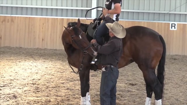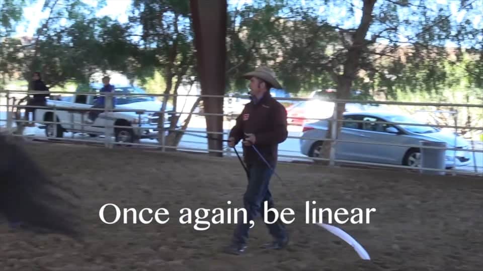 Filmed at the Los Angeles clinic, in this session is with a horse that anticipates flying lead changes. The owner does a few lead changes…